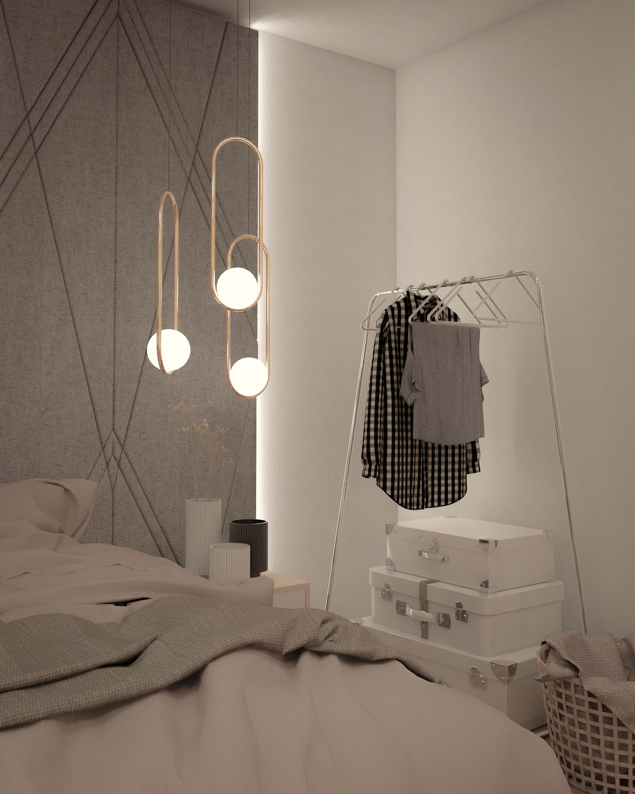 En el dormitorio se opta por dar protagonismo al elemento principal mediante un cabecero tapizado especialmente diseñado para el cliente y al que se le aplica una luz indirecta, dando prioridad al descanso y bienestar de quienes le darán uso.